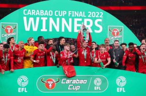 Liverpool celebrate winning the Carabao Cup last season after beating Chelsea on penalties.
