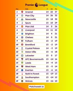 Arsenal sit top and hold a 5 point lead over Manchester City who are second on 32 points. Newcastle United, who exceeded expectations in the first part of the season, sit in third on 30 points ahead of Tottenham on 29 points. Manchester United on 26 points and Liverpool on 22 close out the top six.