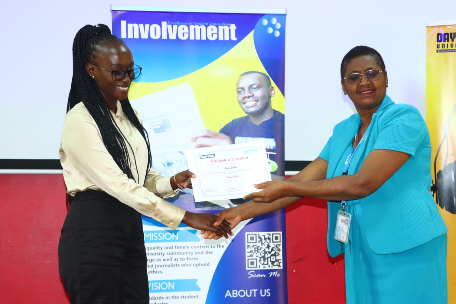 Mrs. Damaris Kimilu who is the Corporate Affairs and marketing Manager at Daystar University, during the handover ceremony was quoted saying as she commended the outgoing team that, “any Managing Editor in any leading media house and not limited to Kenya media houses would consider you for employment because you have evidence that you were involved in some work while in school”.  She continued to add that, “one of the things we do in Corporate Affairs outside of your media platforms is we decided to give captions to our reporters starting with Mr. Hannington Karanja who is the immediate former Nairobi bureau chief as an example”. This decision was welcomed with cheers and loud of applause by the people present.